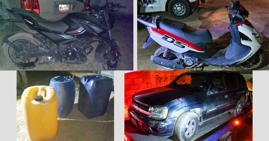 En una primera intervención, personal operativo aseguró a una persona del sexo femenino y un masculino, además de localizar 65 dosis de sustancia granulada con características propias del cristal, 100 dosis de hierba verde con características propias de la marihuana, una camioneta y una motocicleta que contaba con reporte de robo. En el mismo predio se encontraron tres contenedores plásticos con un total de 150 litros de hidrocarburo, así como un teléfono celular aparentemente destinado a la coordinación de ilícitos.
