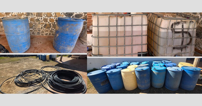 Derivado de trabajos de inteligencia interinstitucional, se ejecutó una intervención estratégica que permitió el aseguramiento de 1,980 litros de hidrocarburo, así como 24 contenedores, dos de ellos tipo “muela” con capacidad de mil litros, los cuales se encontraban abastecidos casi en su totalidad.