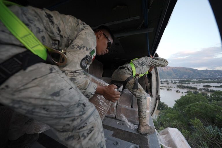 En la Vega de Metztitlán, los oficiales de descarga se anclan con un arnés para salir del helicóptero y soltar los víveres y sin poner en riesgo a la población que las recibe.