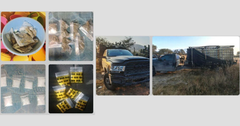 Durante la intervención, los cuerpos de seguridad localizaron un total de 93 dosis de hierba verde con características propias de la marihuana, así como 43 dosis de sustancia cristalina con características del cristal. Además, en el sitio fue asegurada una camioneta con reporte de robo, junto con 15 contenedores plásticos de distintos tipos que en conjunto almacenaban 5 mil 170 litros de hidrocarburo.